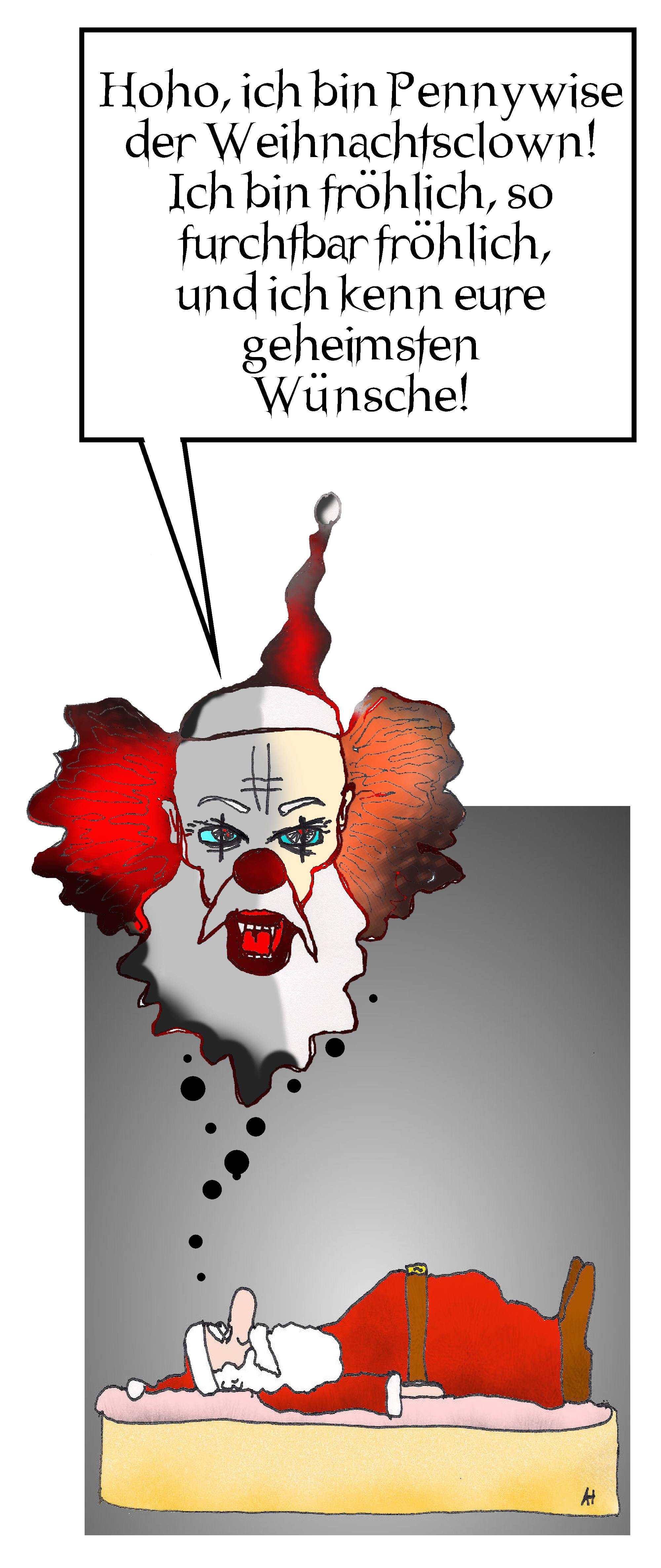 Am nächsten Morgen wacht der Weihnachtsmann schweißgebadet auf.“…fröhlich, fröhlich, fröhlich …“ hallt es, einem Mantra gleich, durch seinen Kopf. Er erinnert sich von einem Weihnachtsmann mit kupferfarbenen Haaren geträumt zu haben und von einem Jungen, dem er nur eine kleine Lumpenpuppe schenken durfte, weil sonst irgendwas schreckliches mit Zahlen passiert wäre.