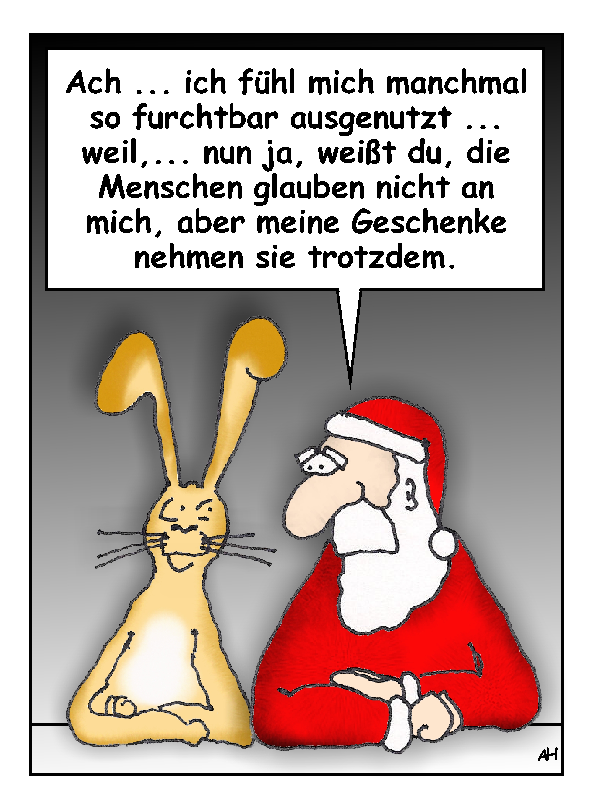 „Ohjeh,“ meint Hazy, nachdem sie eine Weile gemeinsam freundschaftlich geschwiegen und gegrübelt haben. „Das ist eine wirklich schlimme Sache!“ Aber weißt du, ich glaube es ist gar nicht so wichtig, dass die Menschen an dich glauben. Viel, viel wichtiger ist es, dass du an dich selber glaubst.“Der Weihnachtsmann grübelt über die Worte seines Freundes nach und ihm wir zusehends leichter ums Herz. Er klopft dem Osterhasen auf den Rücken und meint „Vielleicht hast du ja wirklich recht.“