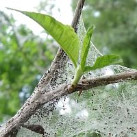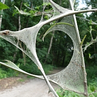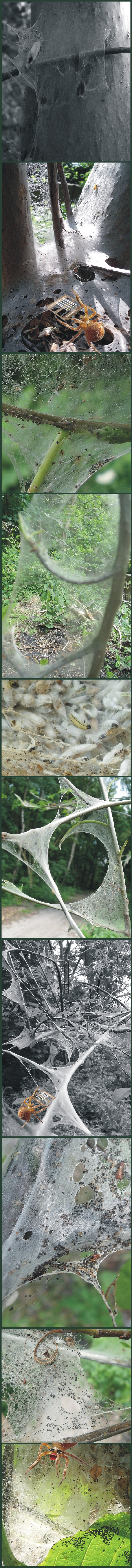 Neeeeee, Olga, das ist das Werk der Gespinstmotte (steht doch unter den Fottos, mein Gott Herrje!). Die gibt es in Europa in 116 Arten (äscht ey, hab bei Wiki geguckt.) Jede Sorte scheint so ihren eigenen (armen) Lieblingsbaum zu haben. Die Raupen sind harmlos. Also für uns Menschen. Auch die Bäume überleben diesen Fressangriff (meist, also wenn sie jung-stark oder alt-weise-stark sind). Wenn die Raupen sich verpuppen um zu Schmetterlingen zu werden, treiben die Bäume wieder aus (->Guck mal das rechte Bild im Teaser).